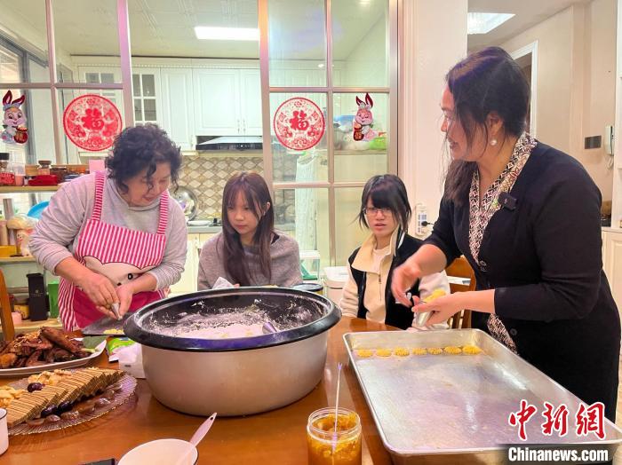 2月5日,蔡蘭妹兒媳婦李月瑤(右一)與家人一起制作印尼糕點(diǎn)。 韋佳秀 攝