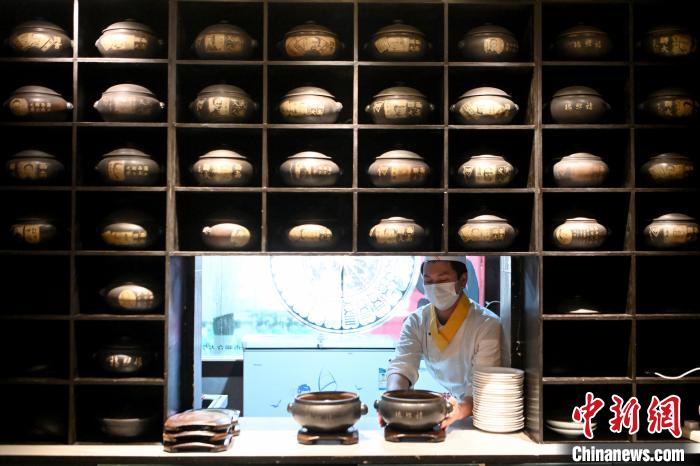 圖為昆明福照樓餐廳內(nèi)汽鍋雞被擺放在點菜臺“C位”?! ±罴螊?攝