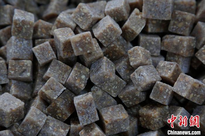 晉祠桂花元宵,餡料是靈魂。傳統(tǒng)晉祠桂花元宵的餡料需要將核桃、芝麻、花生翻炒去皮后,再把糖稀加熱化開,加入白糖、冰糖、純天然玫瑰花醬和桂花醬翻炒,炒制完成后放入模子壓實搟平,晾曬切塊。