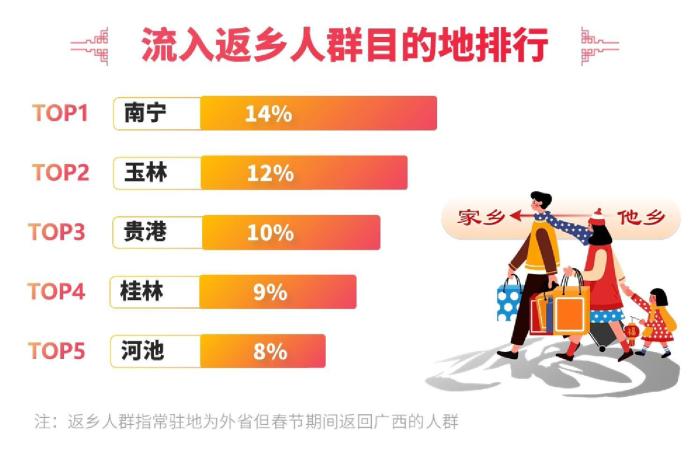 春節(jié)期間,廣西迎來客流高峰。據(jù)統(tǒng)計,廣西流入客流同比增長7%,流出客流同比增長18%,凈增客流超過1000萬人。其中,返桂人潮占比25%,男性成為返鄉(xiāng)主力,占比58%?!?0后”和“90后”人群成為返鄉(xiāng)主流,占比超過50%。交通出行方面,短途游備受青睞,200-500公里出行占比達到48%,汽車成為首選出行方式。
