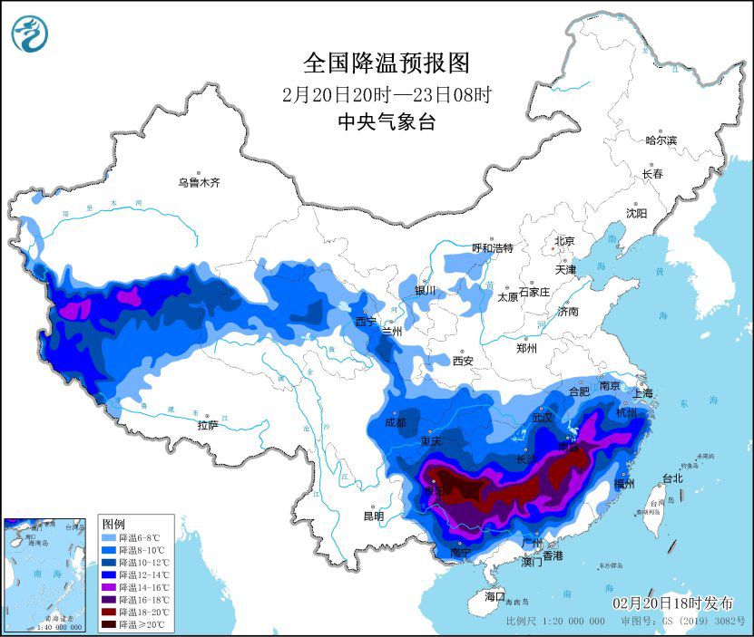 中新網2月20日電 據中央氣象臺網站消息,中央氣象臺2月20日18時繼續(xù)發(fā)布寒潮橙色預警:受寒潮影響,預計,2月20日20時至2月23日,我國南方大部地區(qū)將出現(xiàn)降溫,日平均或最低氣溫普遍下降8~12℃,西南地區(qū)東南部、江南大部、華南中北部等地氣溫下降12~18℃,其中,貴州東南部、湖南西南部、廣西北部等地的部分地區(qū)累計降溫幅度可達20℃以上。2月23日前后,最低溫度0℃線將南壓到蘇皖南部至湖南南部、貴州南部一帶。