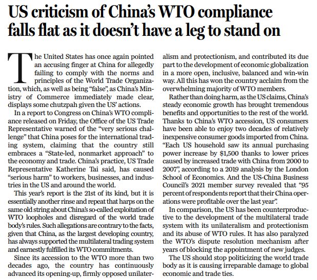 原標題:US criticism of China's WTO compliance falls flat as it doesn't have a leg to stand on