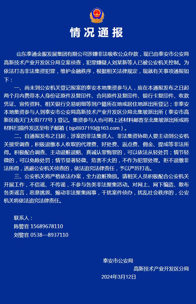 中新網(wǎng)3月13日電 山東泰安高新警方12日在官方微信公眾號發(fā)布山東泰通金服發(fā)展集團(tuán)有限公司涉嫌非法吸收公眾存款的情況通報,目前該案件已由泰安市公安局高新技術(shù)產(chǎn)業(yè)開發(fā)區(qū)分局立案偵查,犯罪嫌疑人劉某新等人已被公安機(jī)關(guān)控制。為依法打擊非法集資犯罪,維護(hù)金融秩序,根據(jù)相關(guān)法律規(guī)定,現(xiàn)就有關(guān)事項通報如下: