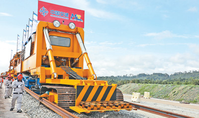 在馬來西亞彭亨州關(guān)丹市馬東鐵項目現(xiàn)場,鋪軌機正在作業(yè)。