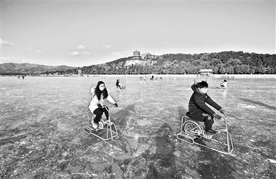 頤和園冰場的景色絕佳,冰場四周環(huán)繞著頤和園的亭臺樓閣,游客在冰面滑行的過程中,可切身感受到古人造園“步移景異”的精妙之處。冰上賞景的最佳選擇是騎行冰上自行車,冰上自行車幾乎對技術(shù)零要求,因為有金屬框架的支撐,騎行時比普通自行車還要平穩(wěn),冰上自行車可快可慢、可??烧荆慰秃粑遒目諝?,眼前則是高大雄偉的佛香閣與遼闊的西山群峰,盡管腳下在奮力地蹬車,在不知不覺間已融入到頤和園的山水畫卷之中。