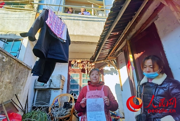 樓房住戶林菊芬(左)稱不久前樓上掉下水泥塊,“住得提心吊膽”。人民網(wǎng)記者 王繼亮攝