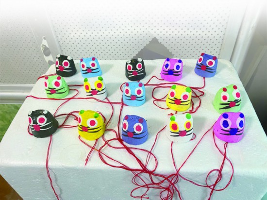 記者來到吳為民的工作室里,一提到“皮老虎”,吳為民滔滔不絕?!啊だ匣ⅰ怯媚嗯吣蟪煽蓯鄣男±匣⒌臉幼樱ㄟ^一只手握住它,另一只手滑動(dòng)它身上的紅線,就會(huì)發(fā)出各種動(dòng)物的叫聲。我做的這個(gè)‘皮老虎’,它能發(fā)出許多種動(dòng)物的叫聲?!眳菫槊褚贿呎f著一邊為記者演示,“隨著滑動(dòng)的頻率的變化,它能發(fā)出各種惟妙惟肖的聲音,有貓叫、青蛙的叫聲、老母雞的叫聲等等?!?/p>