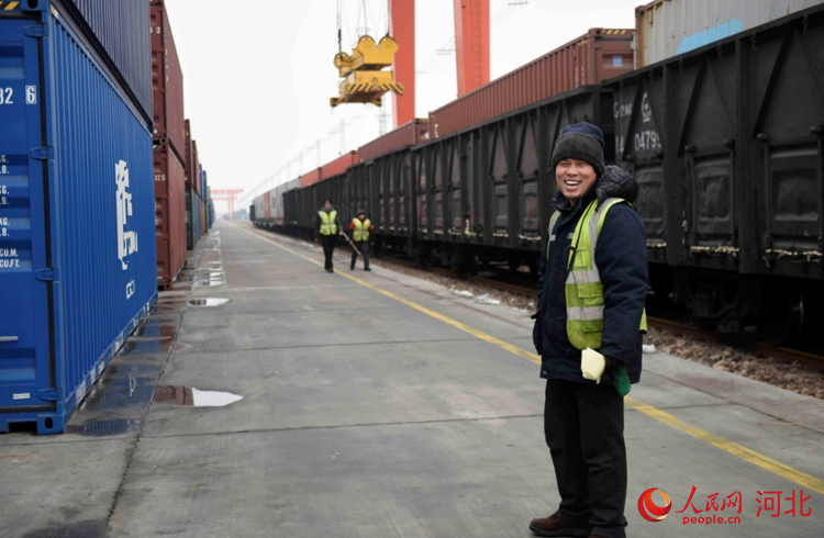人民網(wǎng)石家莊2月2日電 (祝龍超)“再往前一點(diǎn),右邊一點(diǎn),好的?!?月2日9點(diǎn),在地面作業(yè)人員的配合下,坐在30多米龍門吊駕駛室的滑恒旭穩(wěn)穩(wěn)地操作著龍門吊車將一個(gè)20多噸的集裝箱放到了貨運(yùn)專列上。