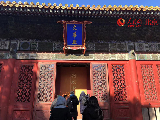 文華殿北側(cè)的文淵閣,作為此次展覽最后一件“展品”,與文華殿展廳結(jié)尾處的《四庫全書》(影印本)遙相呼應。人民網(wǎng)記者 鮑聰穎 攝
