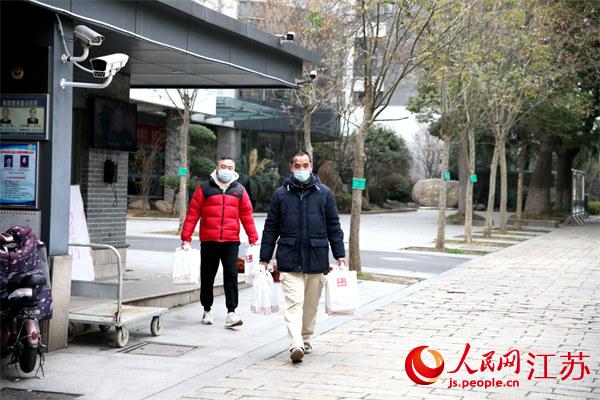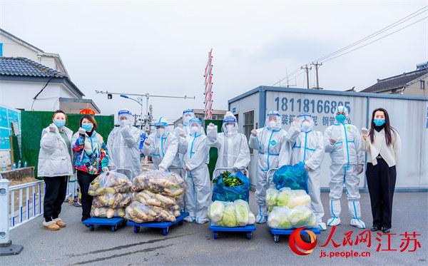 蘇州吳中區(qū)木瀆鎮(zhèn)愛心人士嚴麗萍(右一)等為管控區(qū)送上愛心蔬菜。木瀆鎮(zhèn)供圖