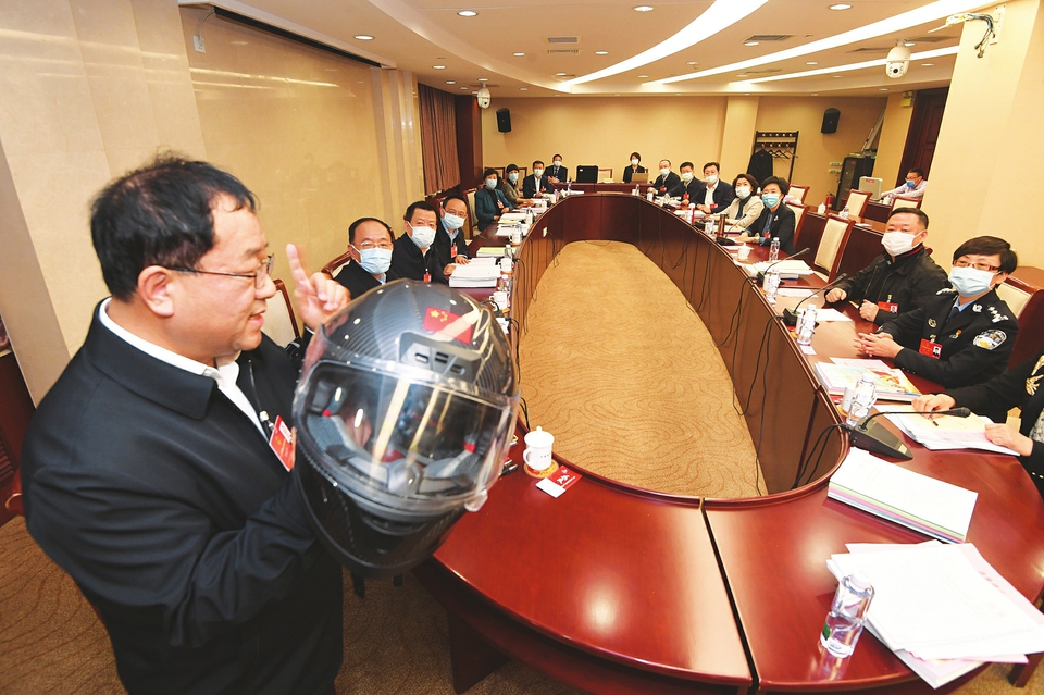 3月7日,山西代表團(tuán)舉行小組會(huì)議。呂春祥代表對(duì)政府工作報(bào)告提出的“今年深入實(shí)施創(chuàng)新驅(qū)動(dòng)發(fā)展戰(zhàn)略”深感振奮,對(duì)“推進(jìn)科技創(chuàng)新,促進(jìn)產(chǎn)業(yè)優(yōu)化升級(jí),突破供給約束堵點(diǎn),依靠創(chuàng)新提高發(fā)展質(zhì)量”充滿信心。他展示了其所在的中科院山西煤化所和山西鋼科碳材料有限公司碳纖維聯(lián)合團(tuán)隊(duì)研發(fā)的TG800碳纖維材料,這一材料應(yīng)用于雪車頭盔,成為今年北京冬奧會(huì)上亮眼的山西名片。(記者李聯(lián)軍攝)