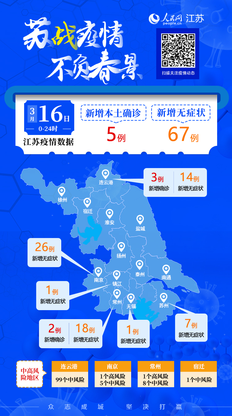 3月16日,江蘇全省累計新增5例本土確診病例,67例無癥狀感染者,涉及常州、連云港、南京、蘇州、無錫、鎮(zhèn)江。3月16日晚,南京棲霞通報5名陽性感染者,目前南京疫情涉及江寧、秦淮、棲霞三區(qū)。