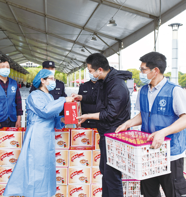3月17日,志愿者給金華市金東區(qū)方艙核酸采樣站抗疫一線醫(yī)護(hù)人員、公安民警,送去水果、八寶粥、草帽等價(jià)值5000余元的物資。金東區(qū)方艙核酸采樣站有120多名工作人員,24小時(shí)為市民進(jìn)行免費(fèi)核酸采樣。(李建林)