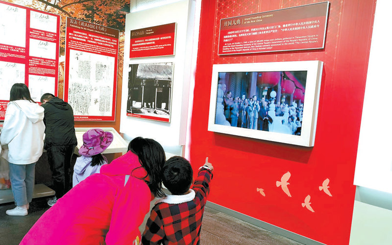 展覽當(dāng)中的一段開國(guó)大典的影像資料讓游客們紛紛駐足?!爸腥A人民共和國(guó)中央人民政府今天成立了!”聽到錄音里毛主席的這段莊嚴(yán)宣告,游客們不由地挺直了腰桿。