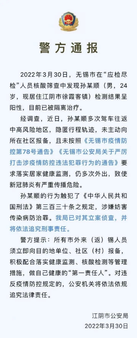 人民網(wǎng)南京3月31日電 (蕭瀟)據(jù)江蘇省無錫市江陰市公安局通報,一陽性男子因故意隱匿行程軌跡,違反抗疫規(guī)定,多次駕車往返中高風險地區(qū),致使新冠肺炎有嚴重傳播危險。公安機關(guān)已對其立案偵查,并將依法追究刑事責任。