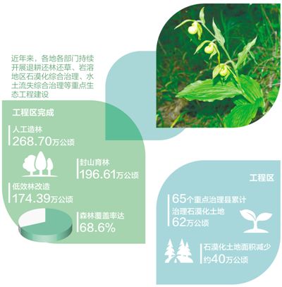 近年來(lái),各地各部門(mén)持續(xù)開(kāi)展退耕還林還草、巖溶地區(qū)石漠化綜合治理、水土流失綜合治理等重點(diǎn)生態(tài)工程建設(shè)。據(jù)統(tǒng)計(jì),工程區(qū)完成人工造林268.70萬(wàn)公頃、封山育林196.61萬(wàn)公頃、低效林改造174.39萬(wàn)公頃,森林覆蓋率達(dá)68.6%;工程區(qū)65個(gè)重點(diǎn)治理縣累計(jì)治理石漠化土地62萬(wàn)公頃,石漠化土地面積減少約40萬(wàn)公頃。