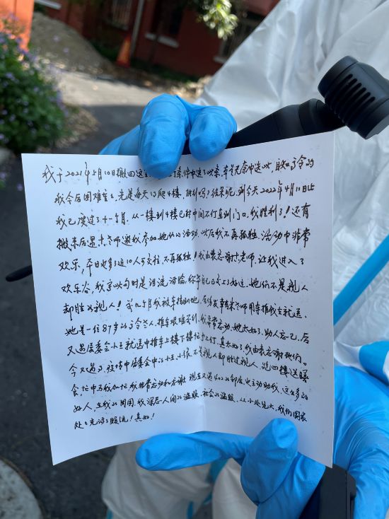 幾經(jīng)推辭,錢留在老人家手里,但她還執(zhí)拗地遞來兩封信,一封短的,本來包鈔票用的:這是給您們和廣大志愿者添些營養(yǎng)品用,望勿拒。還有封長信里提到,“疫情中,居委會(huì)的小王、小張,不是親人卻勝過親人,跑四樓送膳食,我非常感謝。”