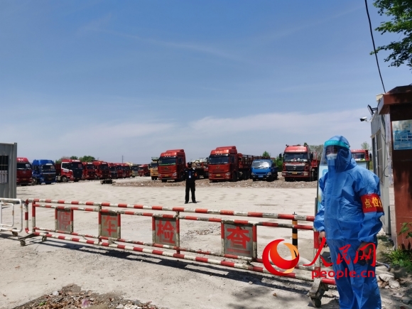 南通市崇川區(qū)陳橋街道疫情防控外來貨車集中停車點。人民網(wǎng)記者 王繼亮攝