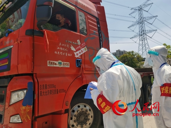 工作人員對外來貨車及駕乘人員進行信息登記。人民網(wǎng)記者 王繼亮攝