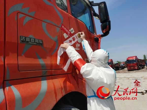 工作人員為外來貨車貼上封條。人民網(wǎng)記者 王繼亮攝