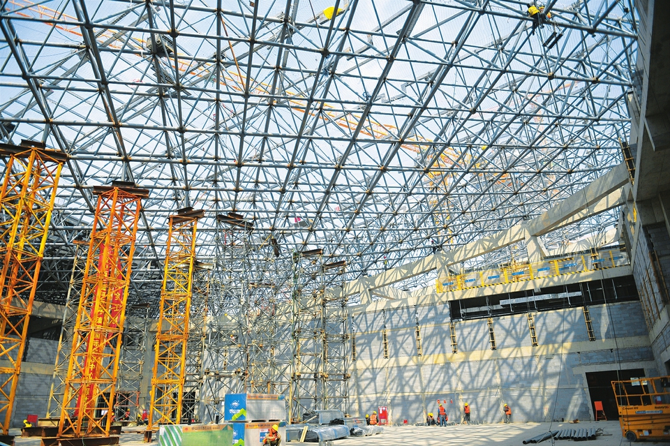 4月24日,瀟河國際會議中心建設(shè)現(xiàn)場,施工人員在做好疫情防控的基礎(chǔ)上,嚴(yán)守安全生產(chǎn)底線,搶抓施工進(jìn)度。(記者王瑞瑞攝)