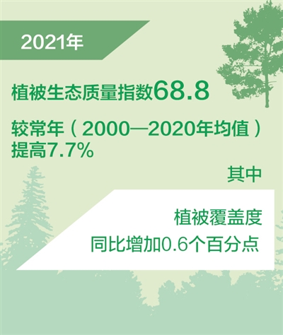 監(jiān)測(cè)結(jié)果表明,2021年植被生態(tài)質(zhì)量指數(shù)為68.8,較常年(2000—2020年均值)提高7.7%。與2020年相比,2021年植被生態(tài)質(zhì)量指數(shù)提高0.4%,其中植被覆蓋度增加0.6個(gè)百分點(diǎn),植被凈初級(jí)生產(chǎn)力增加0.7克碳/平方米。