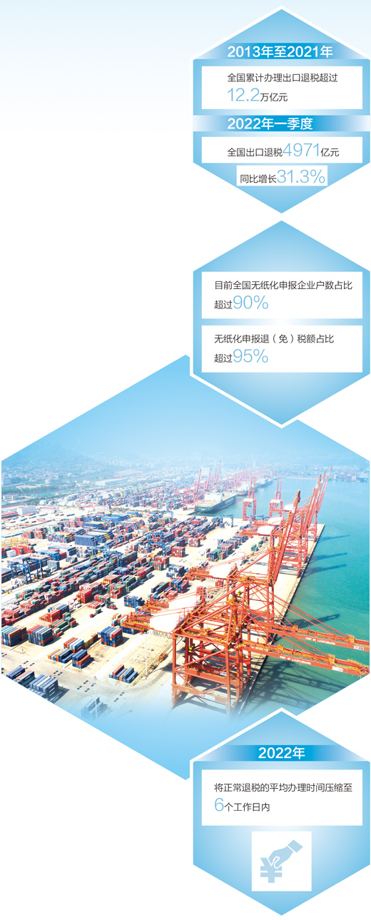 資金是企業(yè)的生命線。為助力外貿企業(yè)發(fā)展,財稅部門落實出口退稅政策,持續(xù)優(yōu)化出口退稅管理。2020年國家提高1464項產(chǎn)品的出口退稅率,稅務部門加強宣傳輔導、精準推送,截至2021年底,共有9.4萬戶企業(yè)因這項政策受益,累計新增退稅377億元,進一步增強了競爭力和抗壓力。2021年,國家稅務總局以出口退稅信息系統(tǒng)整合優(yōu)化為契機,大幅簡并優(yōu)化退稅申報表單資料及辦稅流程,使出口退稅管理體系業(yè)務更全面、流程更優(yōu)化、權責更清晰、運行更高效。