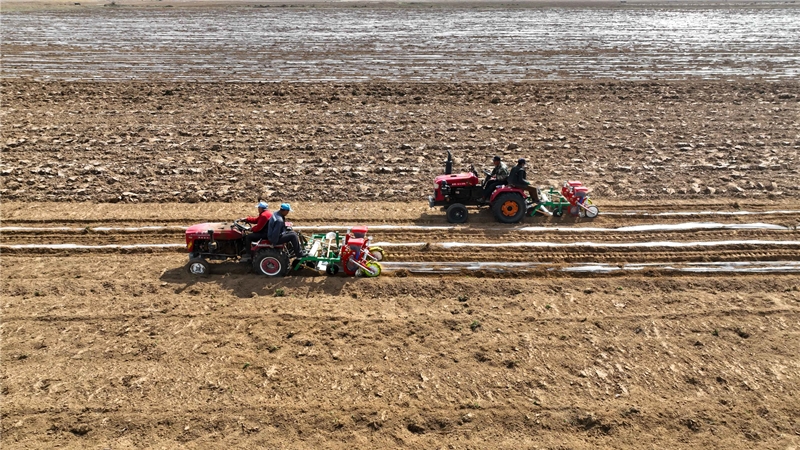 朔城區(qū)南榆林鄉(xiāng)青鐘村玉米核心區(qū)播種現(xiàn)場,應用了膜側播種技術的播種機在田間播種作業(yè)。高文武 攝