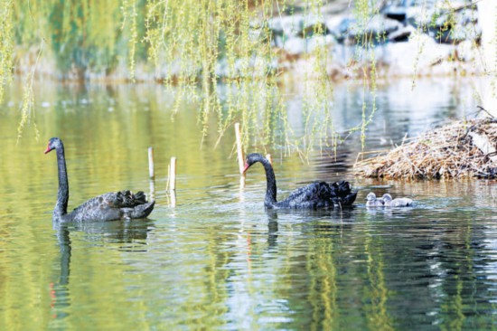 3月29日,圓明園九州景區(qū)后湖里,一對(duì)黑天鵝寶寶成功孵化,兩只小天鵝立即成為圓明園新寵,吸引了眾多攝影愛(ài)好者前來(lái)拍攝。黑天鵝一家在湖中時(shí)而靜靜游動(dòng),時(shí)而將頭扎進(jìn)水中覓食,映襯著一湖碧水和如煙的拂柳,構(gòu)成一幅絕美的自然畫(huà)面。湖邊還有一只黑天鵝正在孵蛋育雛,周邊放置的警戒線(xiàn)幫助黑天鵝安全育雛。游客們也只是遠(yuǎn)遠(yuǎn)地靜靜地看看,生怕驚擾了這“一家人”。