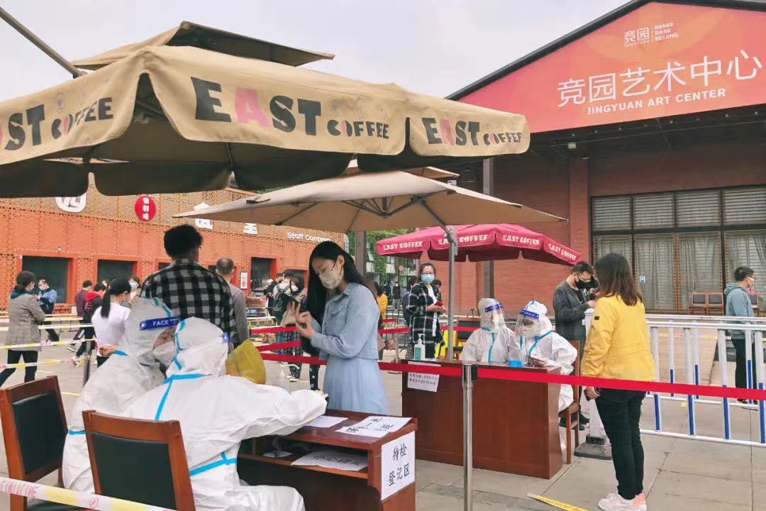 在通惠河畔文化創(chuàng)意產(chǎn)業(yè)園核酸檢測點,一枚枚紅色“黨員志愿服務”袖標格外醒目。