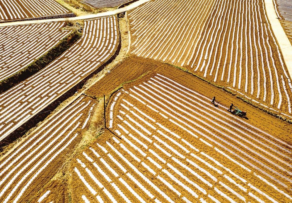 5月15日,晉中市左權縣下莊村鋪滿地膜的農田在陽光照射下,構成一幅錦繡太行的詩畫田園景致。近年來,左權縣積極落實糧食直補,地膜、農機財政補貼的政策,極大地調動了農民種糧的積極性,糧食連續(xù)獲得豐收。同時,通過農旅融合,詩畫般的田園風光吸引了不少游客,助推農民增收。(邢蘭富)