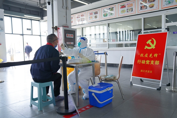 核酸檢測(cè)團(tuán)隊(duì)走進(jìn)制造業(yè)企業(yè)。濱江開(kāi)發(fā)區(qū)供圖