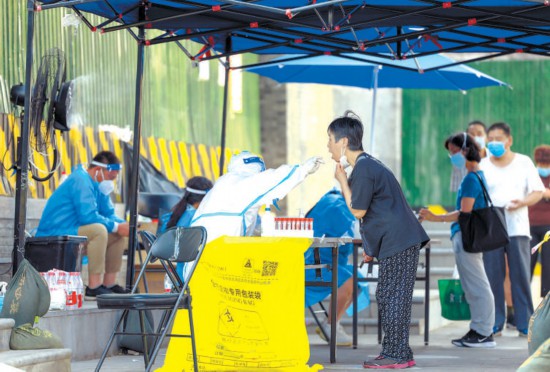 北京28日迎來今年首個高溫日,為應對高溫,北新橋地鐵站附近的核酸檢測點,設置遮陽篷、風扇等設施,確保檢測順利進行。本報記者 潘之望攝