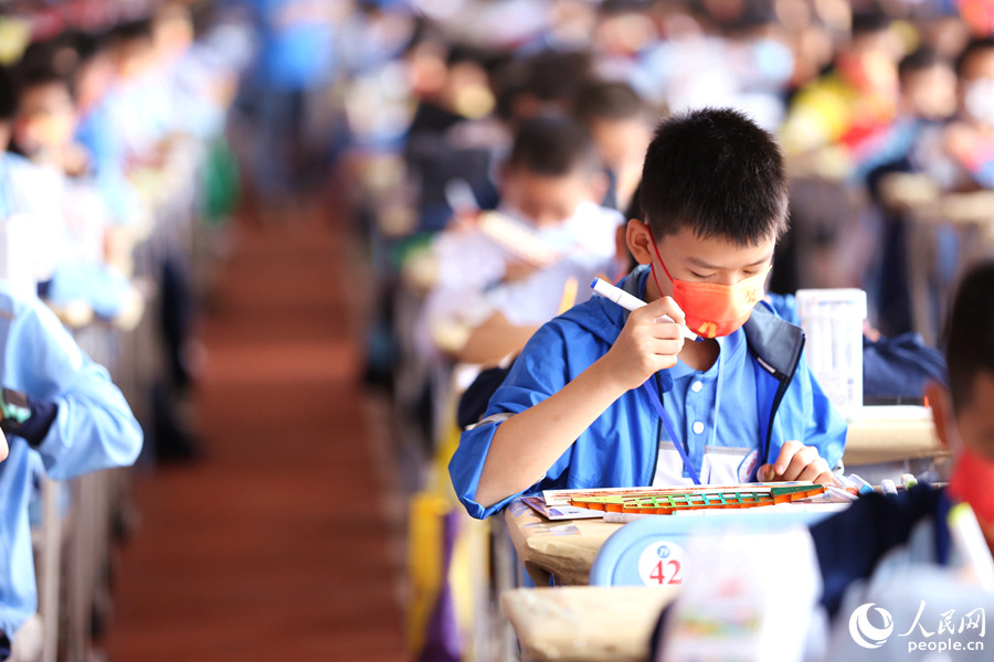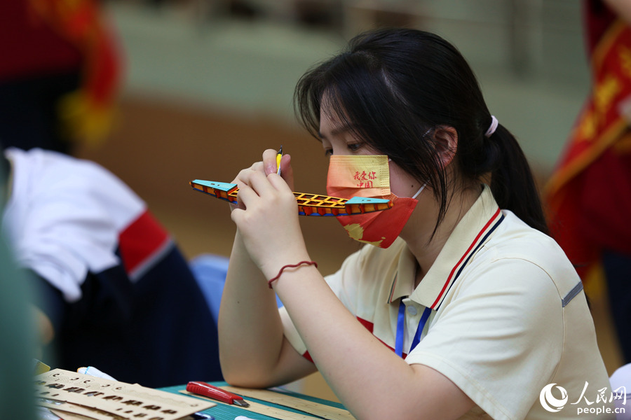 活動現(xiàn)場,選手們列隊(duì)進(jìn)入各自賽場,用畫筆在龍舟模型素材板上畫出各式圖案,再將一個個零部件手工拼接,組裝成一條條獨(dú)具特色的“小龍舟”,船體或是金銀鱗甲,或是祥云波浪,色彩斑斕,風(fēng)格不一。