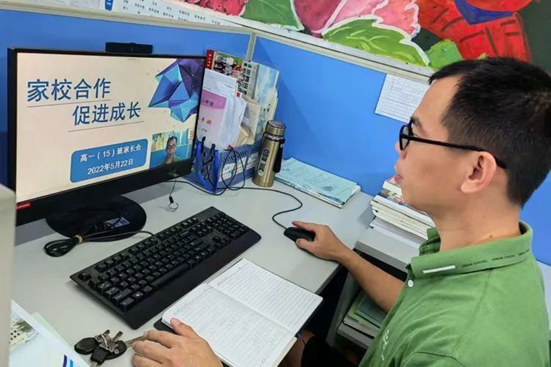 5月22號(捐獻造血干細胞的前一天),韓熠光在年級辦公室召開線上家長會。海口市第二中學(xué)供圖