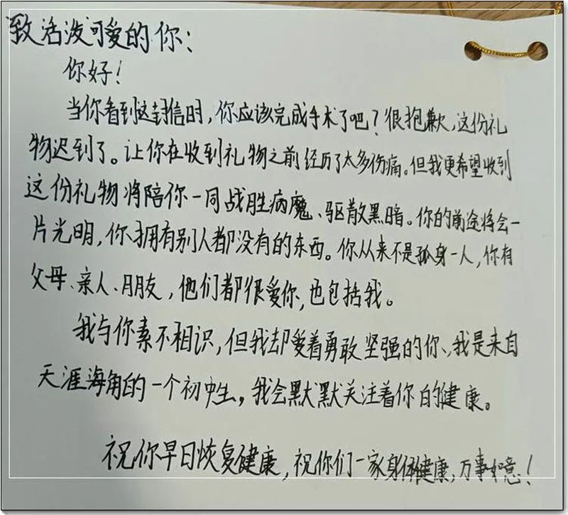 愛是傳遞也是傳承。韓熠光的女兒在得知父親去做捐獻手術(shù)時,手寫了一封祝福信寄給遠方那位素不相識的“弟弟”,鼓勵他早日戰(zhàn)勝病魔,恢復(fù)健康。生命的種子,正伴隨著溫暖椰風(fēng),給6歲的小男孩送去生的希望……