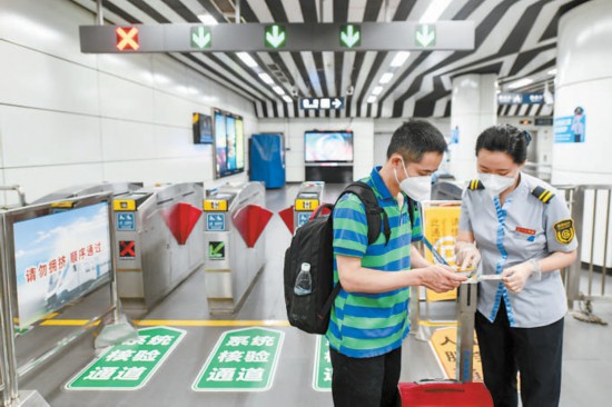 昨天,在亮馬橋地鐵站,乘客通過升級后的系統(tǒng)核驗通道進站。圖為工作人員指導乘客進行升級。 本報記者 鄧偉攝
