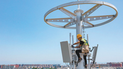 山西省運城市加快發(fā)展數字經濟,加大5G網絡投資建設力度。圖為技術人員在運城市紅盾花園南5G基站點安裝調試設備。