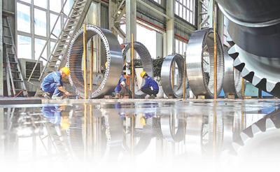 在中國船舶重慶齒輪箱有限責(zé)任公司,工人們正對風(fēng)力發(fā)電機(jī)內(nèi)齒圈進(jìn)行清洗及外觀檢查。