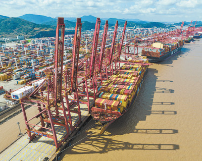 浙江寧波舟山港穿山港區(qū)集裝箱碼頭作業(yè)場景。