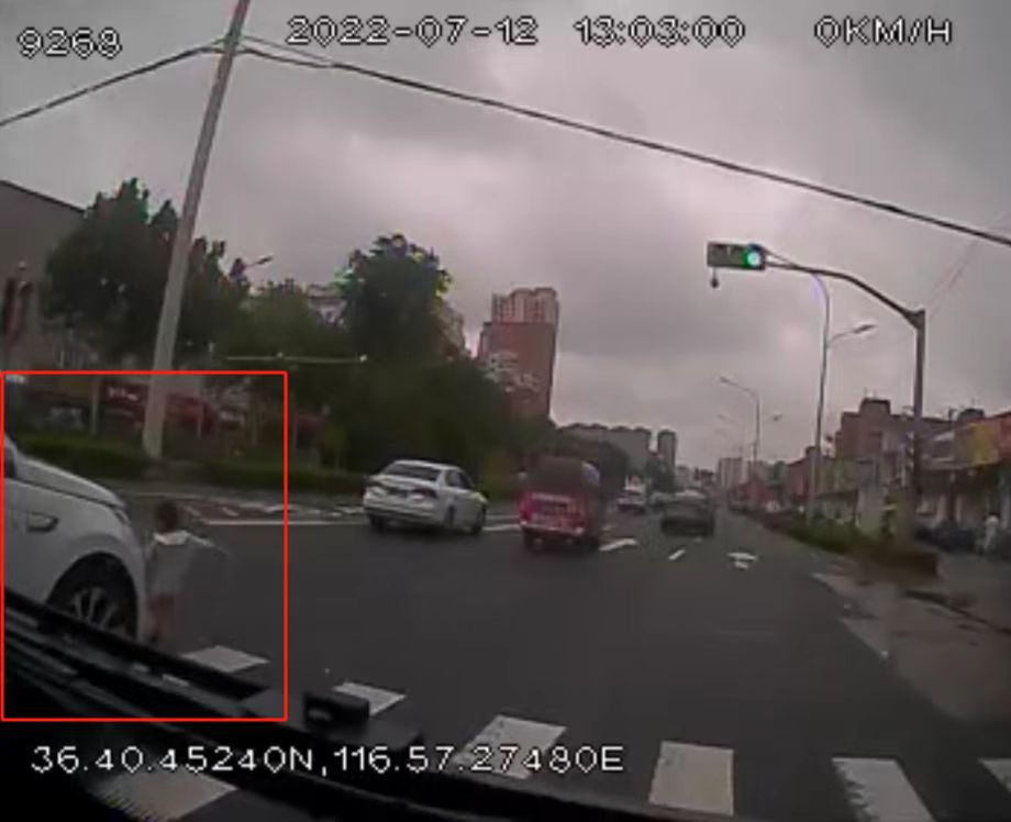 車載監(jiān)控畫面顯示,路口正值綠燈,一位4歲左右的兒童突然從斑馬線上跑出,橫穿馬路。危急時刻,開在道路最右側(cè)車道的濟(jì)南公交B120路駕駛員張濱迅速踩下剎車,在公交車停下的同時,張濱為提醒其它車輛注意到在駕駛視線盲區(qū)的兒童,趕緊將手伸出窗外不停揮舞、呼喊。