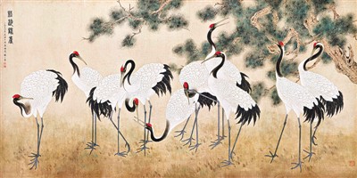 《松齡鶴壽圖》是陳之佛工筆花鳥(niǎo)中尺幅較大的一幅,是為慶祝中華人民共和國(guó)成立十周年的獻(xiàn)禮作。10只體態(tài)優(yōu)雅的丹頂鶴,安逸地徜徉于大地之上,或昂首唳天,或回首顧盼,或凝神遠(yuǎn)眺,蒼翠的古松由畫(huà)面右上方伸入,枝干蒼勁古樸,松枝郁郁蔥蔥,蘊(yùn)含著無(wú)限生機(jī)。陳之佛在中國(guó)畫(huà)傳統(tǒng)線描基礎(chǔ)上,將西洋畫(huà)和裝飾畫(huà)的線條加以改造后融入其中,使線條的表現(xiàn)力更為豐富。