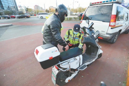 菜市口路口,西城區(qū)交通支隊民警對私自改裝電動自行車的違法行為進(jìn)行查處。本報記者 甘南攝(資料片)