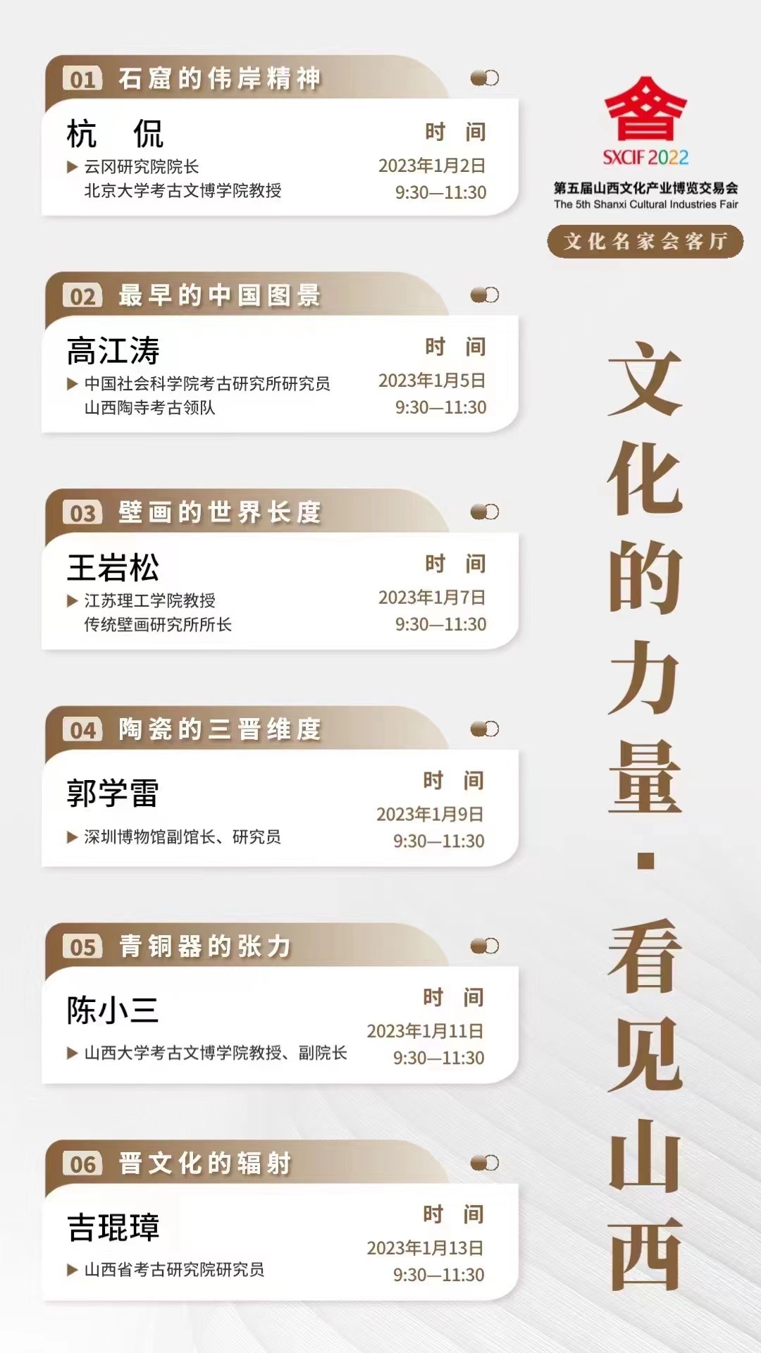 山西歷史悠久,文化資源深厚,在豐富的歷史遺存里,留存有無數(shù)山西智慧、山西力量。本次“文化名家會(huì)客廳”就是以“文化的力量·看見山西”為主題,從組成山西文化的文博、考古元素入手,邀請(qǐng)6位在全國有影響的專家進(jìn)行線上講座,以各自不同的空間和文化視角,分列主題,對(duì)山西文化資源進(jìn)行分析觀照,探討如何更好、更深、更有效地發(fā)掘當(dāng)下有利于彰顯山西文化的優(yōu)質(zhì)要素,助力山西文化事業(yè)高質(zhì)量發(fā)展。