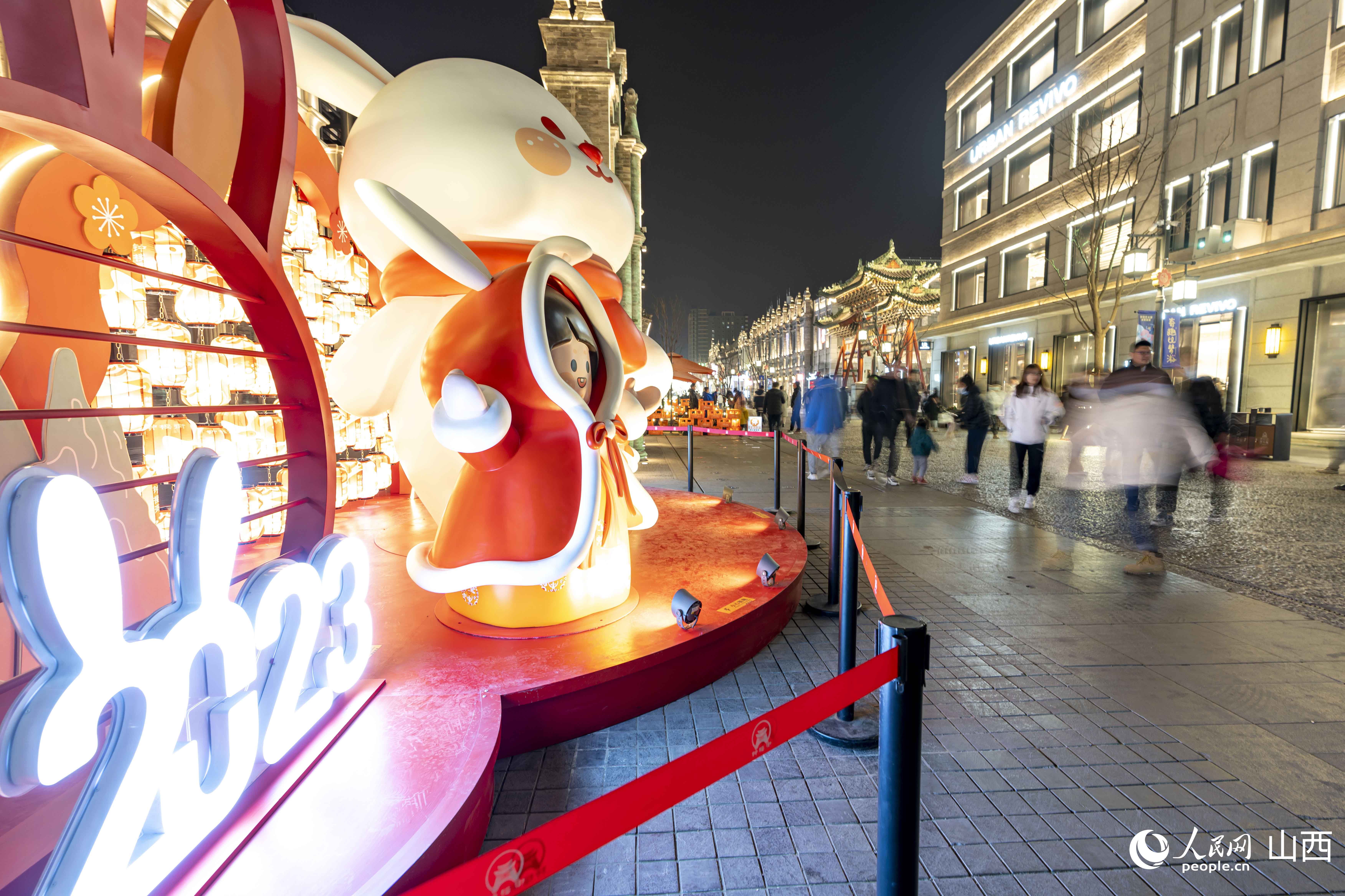 每逢夜幕降臨,鐘樓街上燈光璀璨,人頭攢動。隨處可見的新年兔子元素,為城市增添了年味,游客紛紛駐足拍照,喜氣洋洋,年味兒十足。
