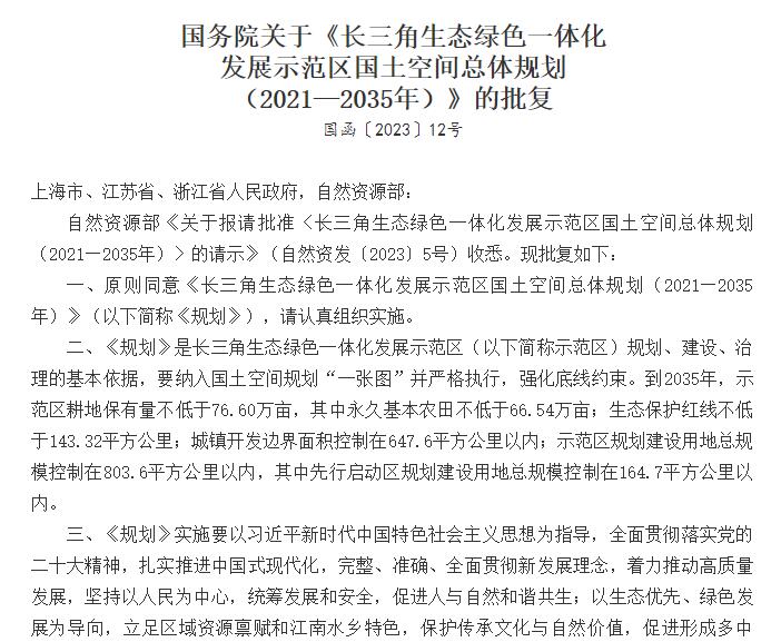 批復強調,上海市、江蘇省、浙江省人民政府要加強組織領導,明確責任分工,健全工作機制,完善政策措施,在《規(guī)劃》的指導下,高水平推進示范區(qū)建設;要嚴守《規(guī)劃》確定的“三區(qū)三線”等國土空間管控底線,聚焦生態(tài)綠色一體化,把生態(tài)保護好,不搞大開發(fā),切實提高土地節(jié)約集約利用水平,防止擴大建設用地規(guī)模,嚴格控制開發(fā)強度,嚴禁隨意撤并村莊搞大社區(qū)、違背農(nóng)民意愿大拆大建,嚴禁違規(guī)興建政府性樓堂館所。