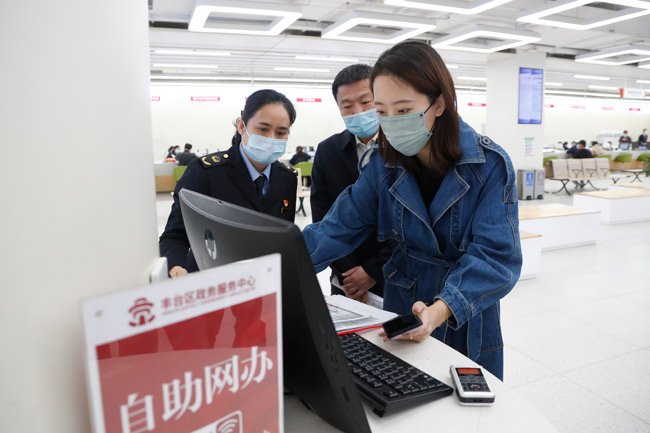 劉鵬琨女士在工作人員的指導(dǎo)下辦理相關(guān)手續(xù)。渠忠濤攝