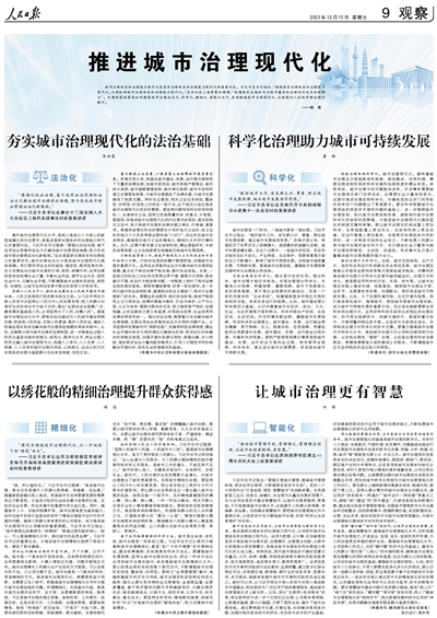 城市治理體系和治理能力現(xiàn)代化是國(guó)家治理體系和治理能力現(xiàn)代化的重要內(nèi)容。習(xí)近平總書(shū)記指出:“推進(jìn)國(guó)家治理體系和治理能力現(xiàn)代化,必須抓好城市治理體系和治理能力現(xiàn)代化?!笨倳?shū)記在上??疾鞎r(shí)強(qiáng)調(diào):“把增進(jìn)民生福祉作為城市建設(shè)和治理的出發(fā)點(diǎn)和落腳點(diǎn)”。本期觀察版圍繞如何提高城市治理法治化、科學(xué)化、精細(xì)化、智能化水平,更好推進(jìn)城市治理現(xiàn)代化、全面踐行人民城市理念進(jìn)行探討。