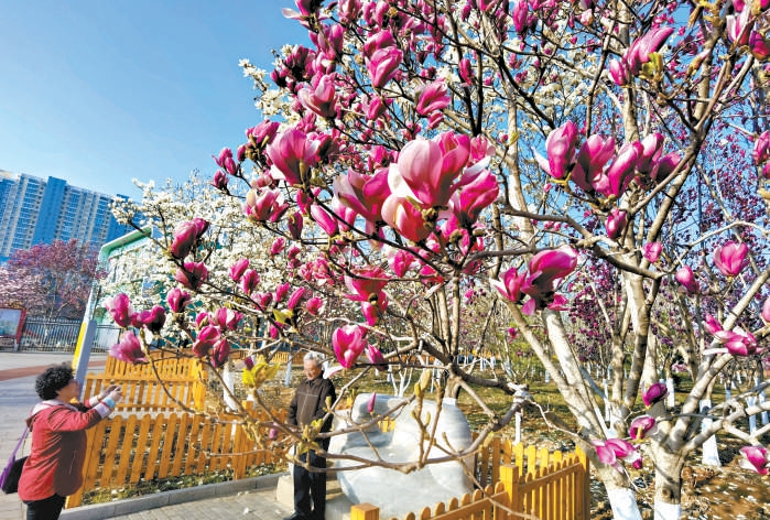 5日,許多市民來到北京國際雕塑公園踏青賞花,在盛開的玉蘭花前拍照留念。本報記者 吳鏑攝