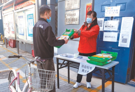 14日,石景山區(qū)古城街道北小區(qū)社區(qū)開展廢舊自行車置換活動(dòng),居民用落灰的自行車換到了整袋的大米。 本報(bào)記者 吳鏑攝